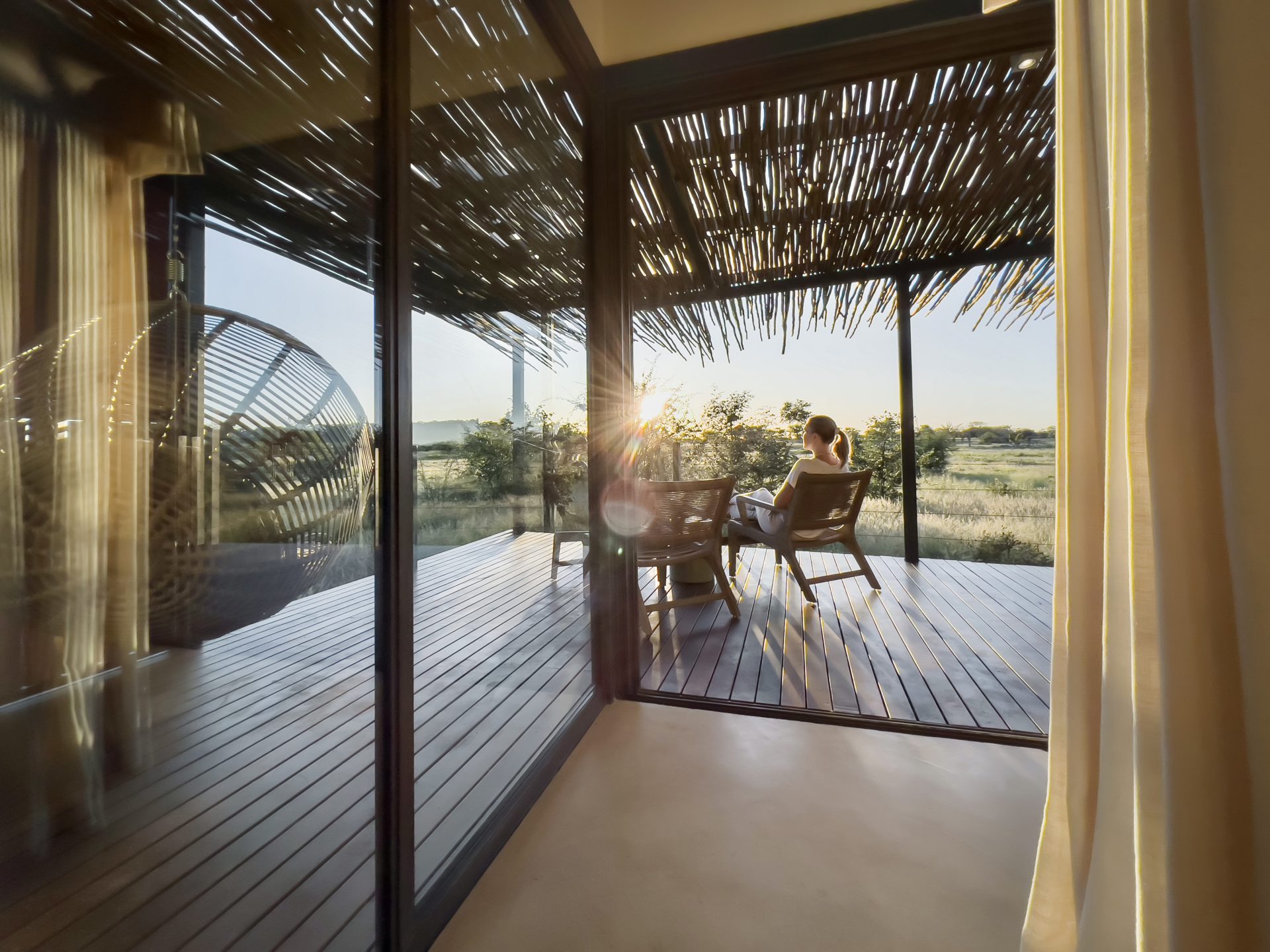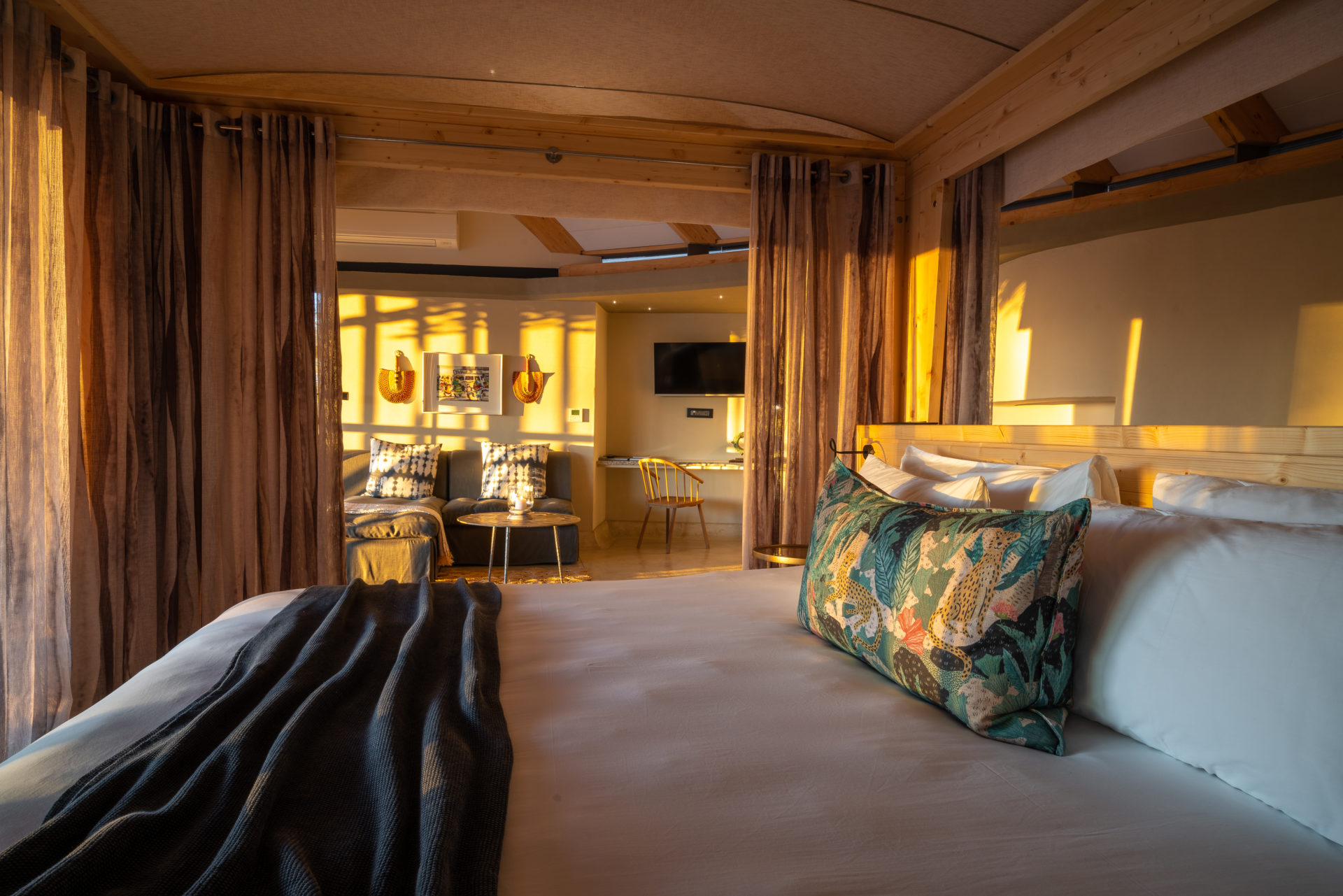Acht Gästezelte stehen leicht erhöht auf hölzernen Plattformen und haben jeweils eine breite L-förmige Terrasse vor sich. Glasschiebetüren öffnen den Blick auf die weite Landschaft. Die Doppelzimmer sind mit zwei Einzelbetten ausgestattet, die alle mit Moskitonetzen verhüllt sind. Die eigenen Badezimmer verfügen über ein Doppelwaschbecken, eine Doppelkopfdusche und eine zusätzliche Außendusche. Die Familiensuite besteht aus zwei Zimmern, jedes mit einem Kingsize-Bett, eigenem Bad und separatem Eingang.
