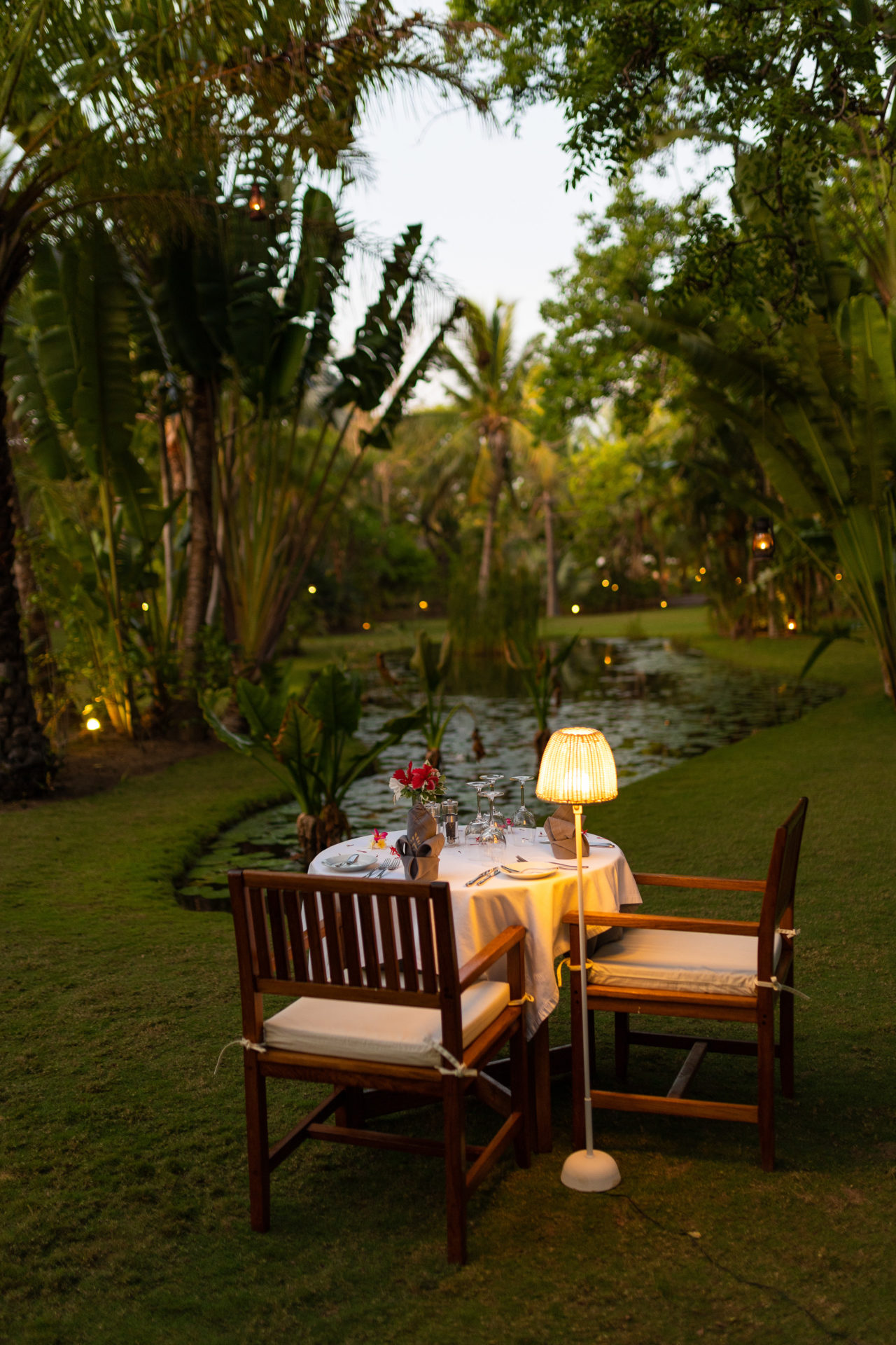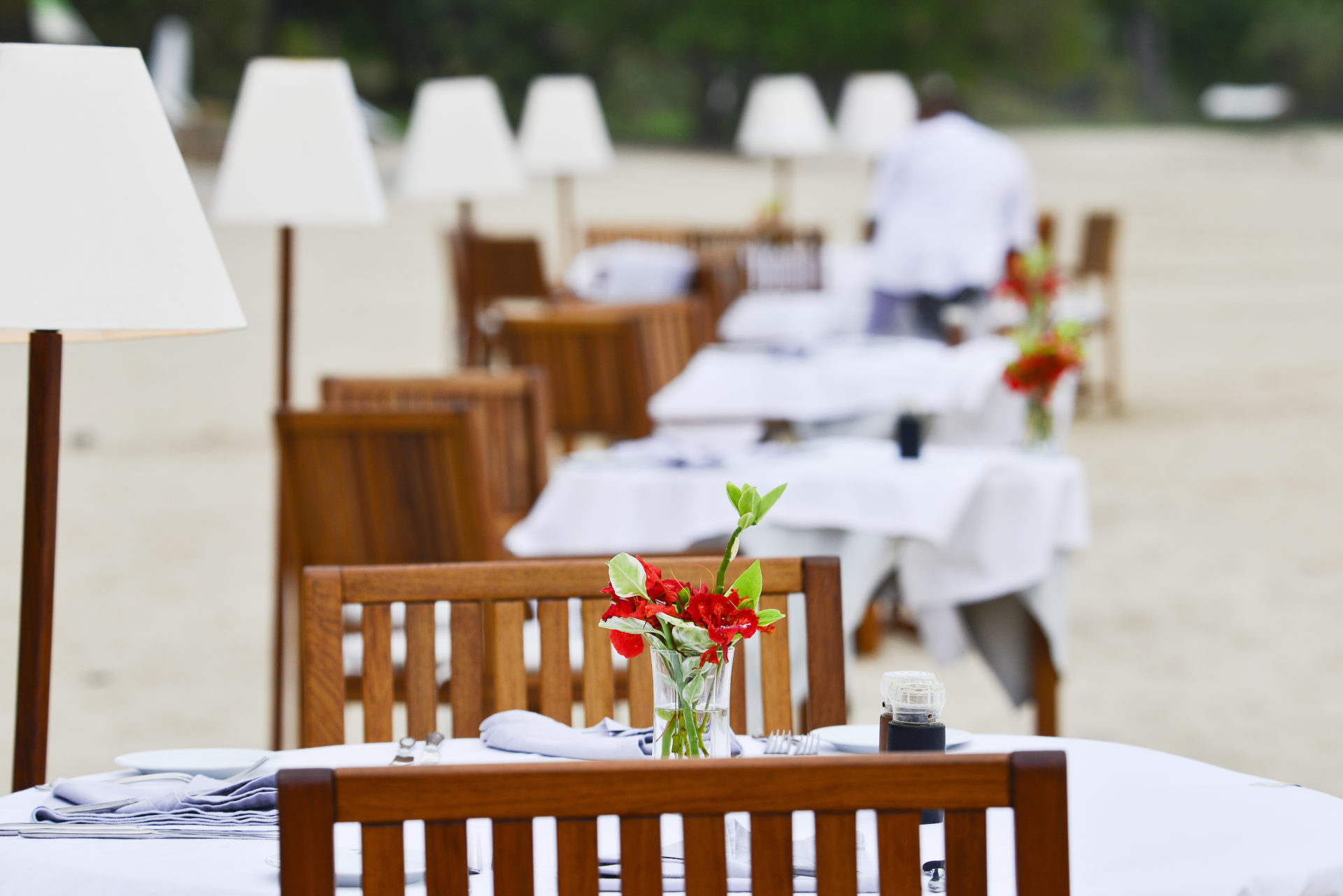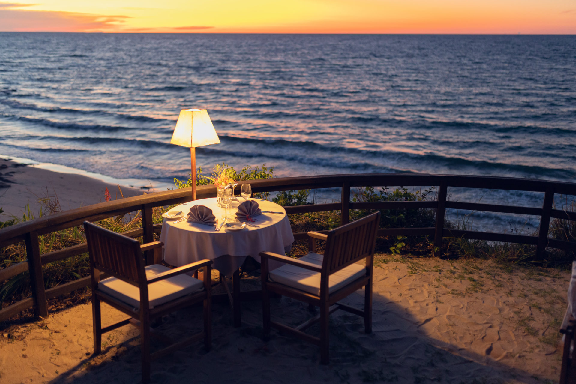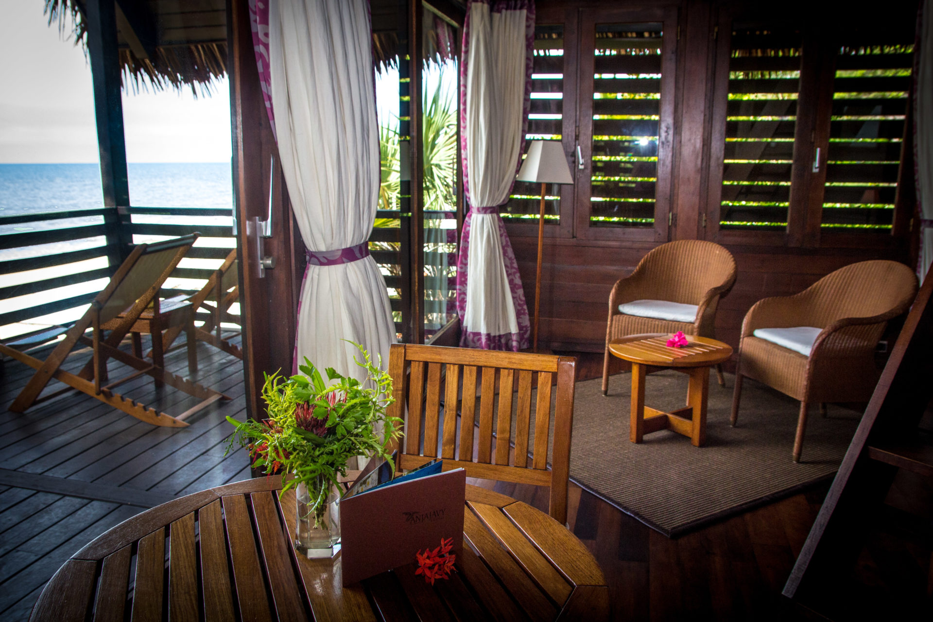Die Vorderseite von Anjajavys Hauptspeise- und Loungebereich säumt eine riesige Terrasse aus Palisanderholz, welche einfach gestaltet ist und über eine Holzbar verfügt. Leintücher in wunderschönem Weiß zieren die Tische, welche einen guten Blick auf die gepflegten Gärten und riesigen Palmen der Anlage bieten. Direkt angrenzend befindet sich ein großer, glitzernder Swimmingpool samt Liegestühlen und Sonnenschirmen. Von dort erreichen Sie in wenigen Schritten den Strand, an dem Sie gerne Ihr Abendessen mit Sand zwischen den Zehen genießen können.