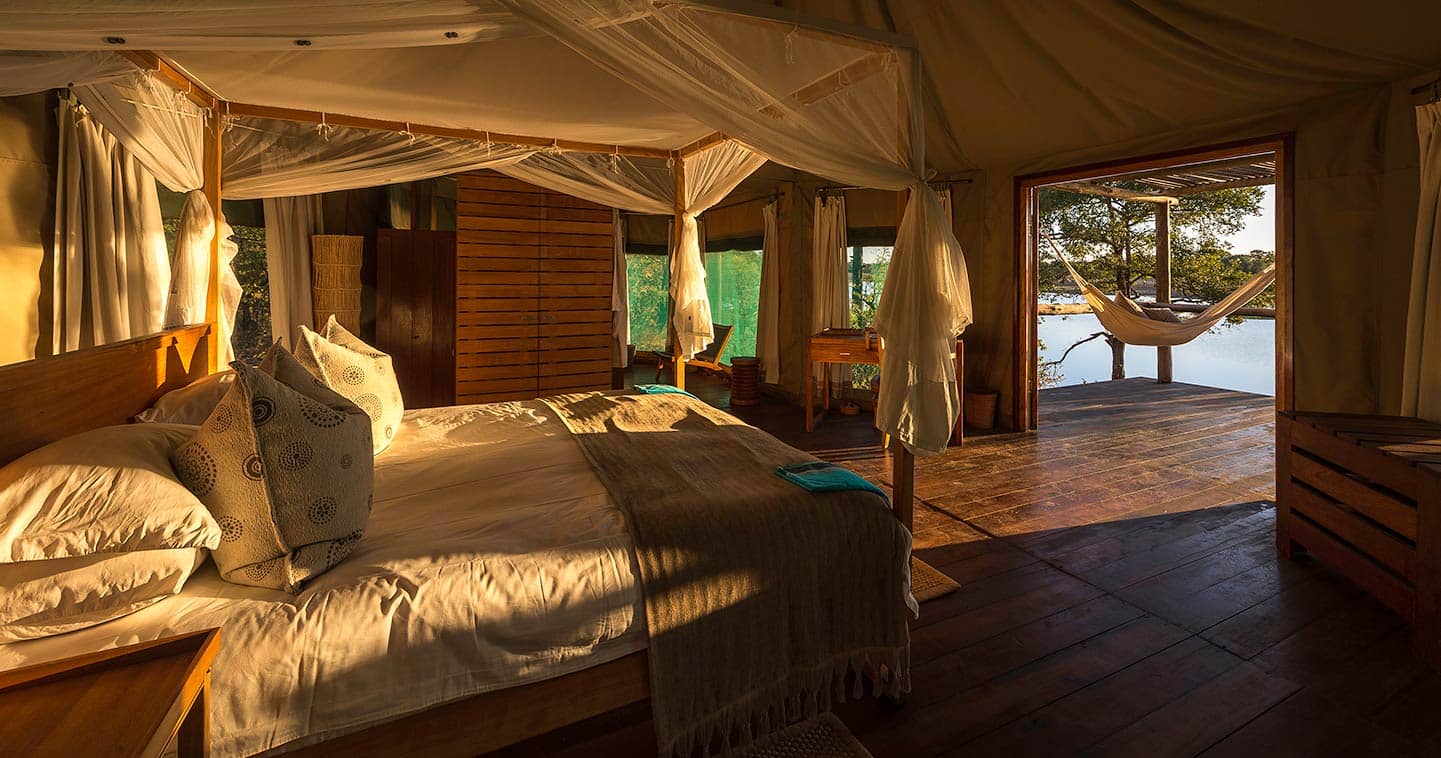 Hängematten mit Traumblick auf die tierreiche Lagune in jedem Zelt.