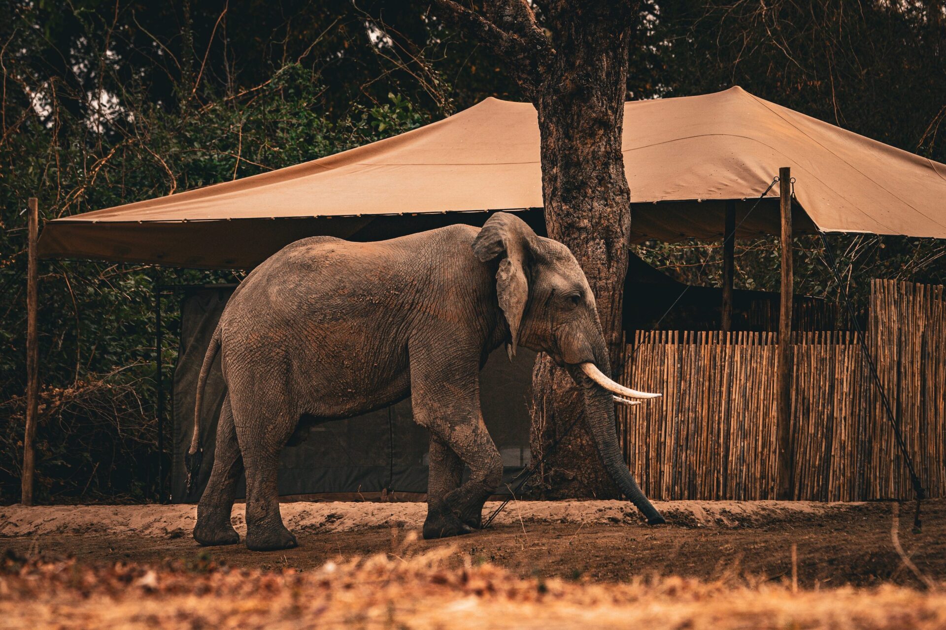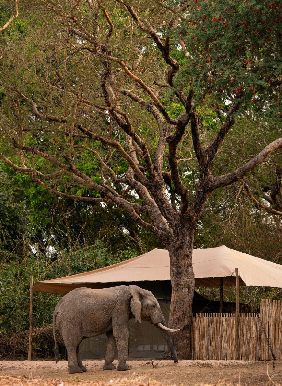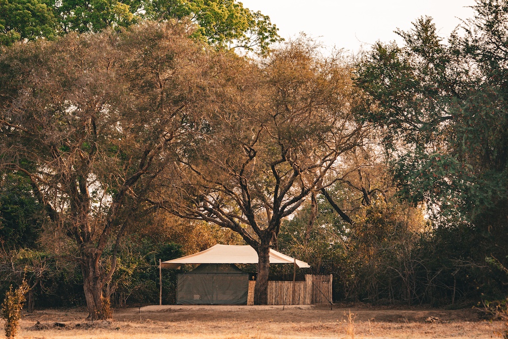 Nur 5 Gästezelte mit eigenem Bad liegen eingebettet in den Auwäldern entlang des Mwaleshi-Flusses – dem Herzen des North Luangwa National Park. Die Zelte sind komfortabel und kühl und mit allem Notwendigen ausgestattet. Dazu gehören eigene Spültoiletten und Safari-artige Warmwasserduschen – bestellen tut man diese wie ein Gin Tonic.