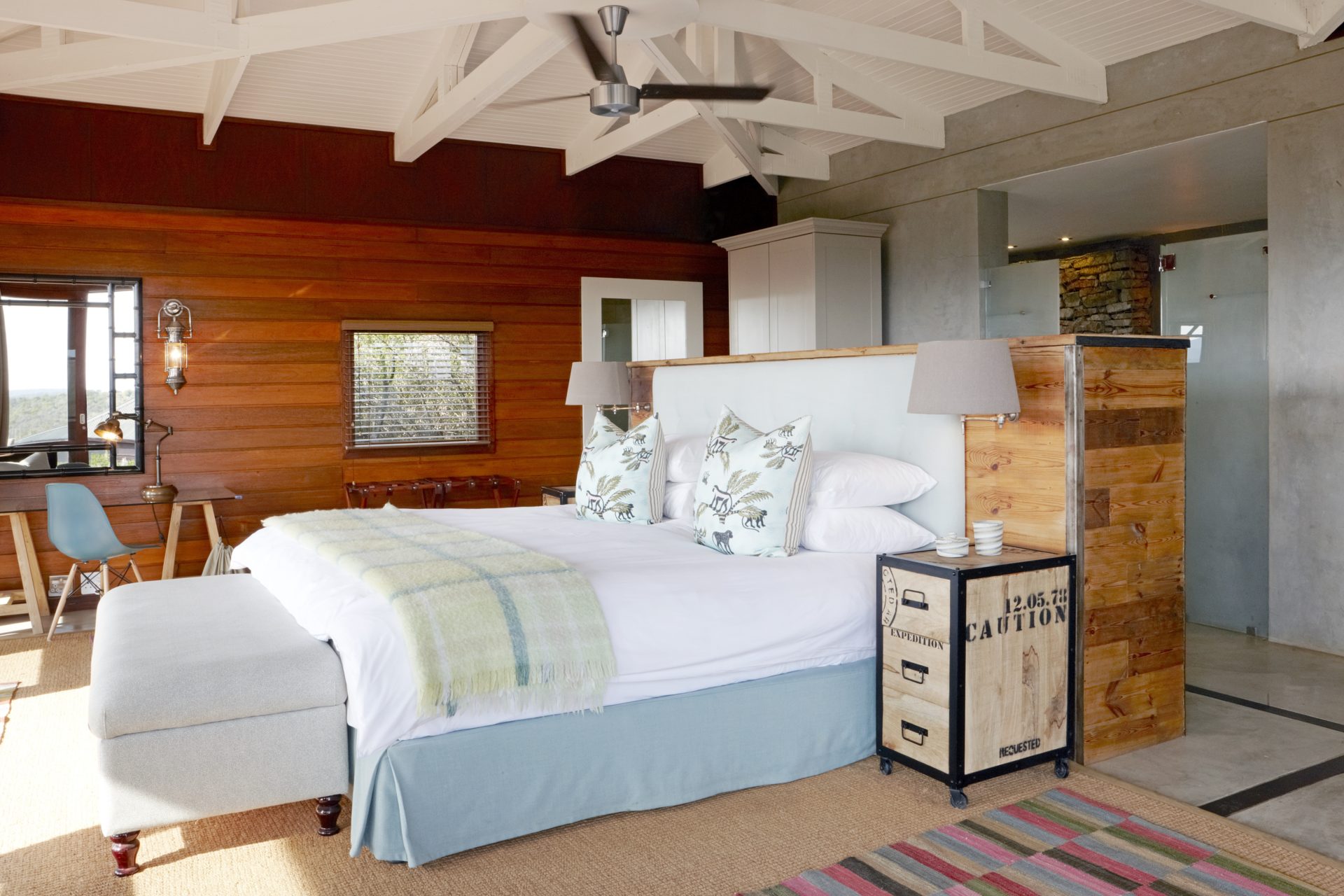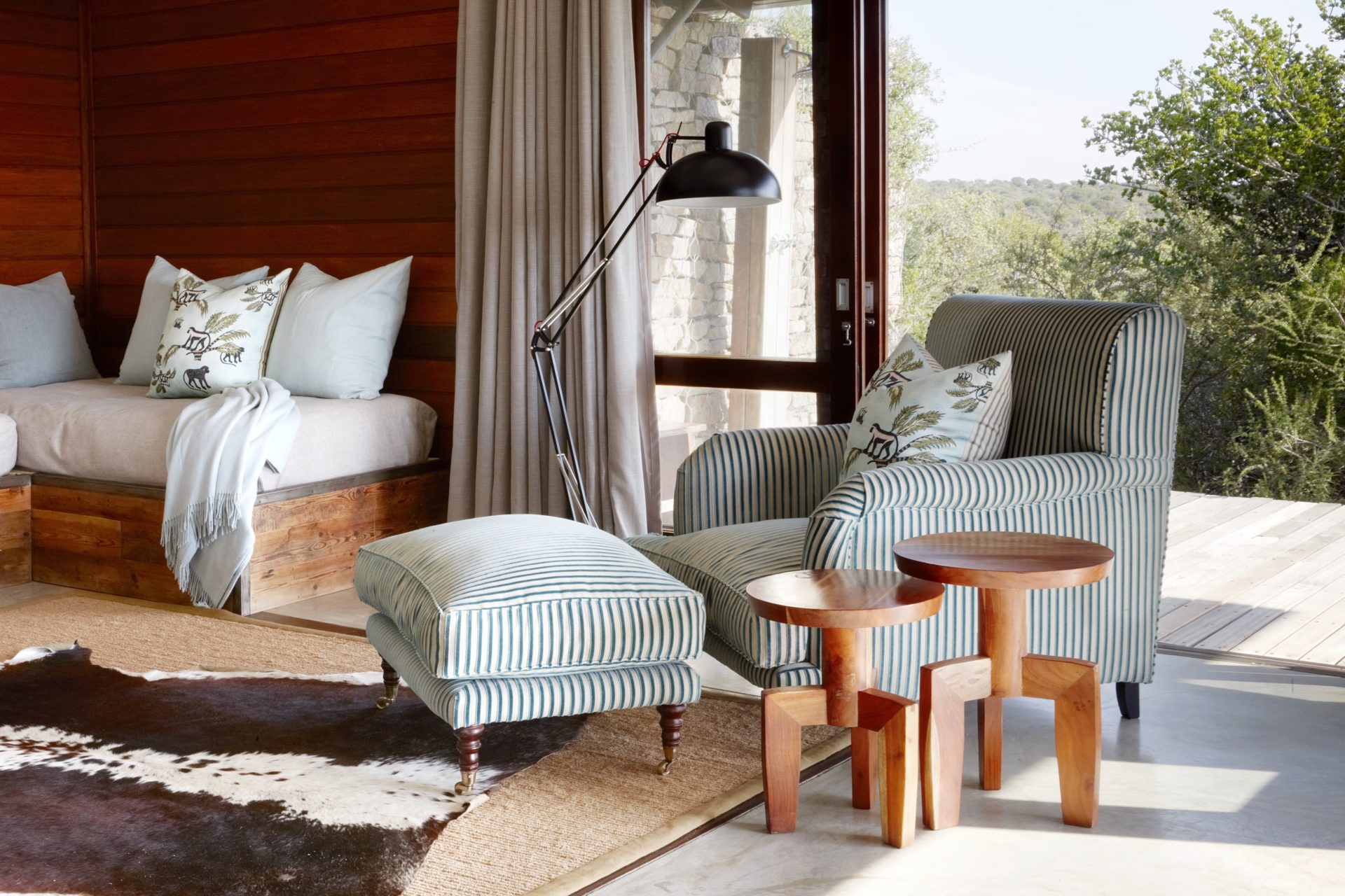 Die Kwandwe Ecca Lodge bietet ein bewusst intimes Safari-Erlebnis in erhöhter Lage mit weitem Blick über ein abgeschiedenes, dicht bewachsenes Tal. Die Aussicht prägt den Charakter der Lodge ebenso wie die ruhige, private Atmosphäre. Der zentrale Aufenthaltsbereich ist modern und offen gestaltet. Glasflächen, Naturstein und großzügige Holzdecks schaffen fließende Übergänge zwischen Innen- und Außenraum und stellen die umgebende Landschaft in den Mittelpunkt. Ergänzt wird der Bereich durch eine kleine Bibliothek, ausgewählte Kunst- und Musikstücke sowie einen Kamin. Ein randloser Pool bietet zusätzliche Rückzugsmöglichkeiten mit Blick in die Natur. Das Design der Innenräume ist klar und zeitgemäß und fügt sich harmonisch in die Umgebung ein. Der Service ist aufmerksam und persönlich ausgerichtet und sorgt dafür, dass der Aufenthalt entspannt und reibungslos verläuft.