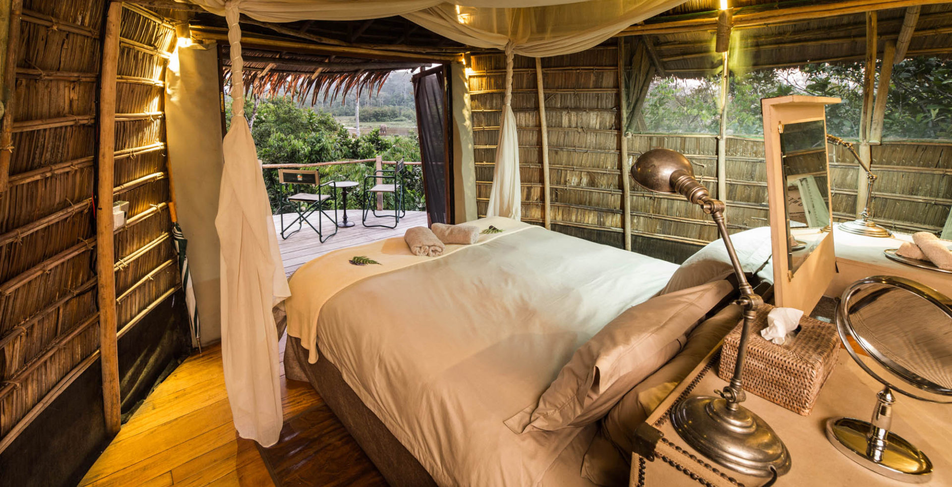 Lango ist ein luxuriöses Camp in einer atemberaubenden Umgebung und liegt eingebettet zwischen tropischem Regenwald und Feuchtgebiet im südlichen Teil des Nationalparks. Die einzigartige Lage bietet den Gästen die Möglichkeit, den unberührten Wald in völliger Abgeschiedenheit auf Pirschfahrten, Piroggenfahrten und Waldspaziergängen für sich zu entdecken. Die bemerkenswerte Umgebung wird Sie auf Schritt und Tritt in ihren Bann ziehen, und die ungewöhnliche Tierwelt wirkt wie ein zusätzlicher Bonus.