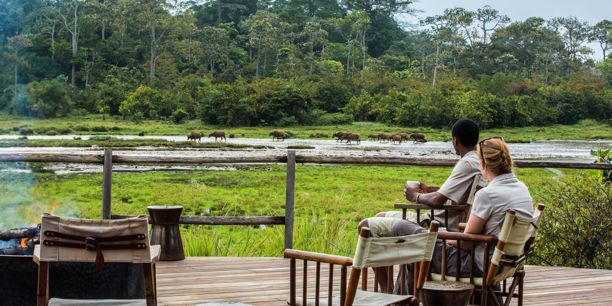 Der Sumpf (im Volksmund "Bai" genannt) vor dem Camp lockt Waldelefanten, Büffel und Buschböcke an und ermöglicht fabelhafte Wildbeobachtungen im Liegestuhl, bei denen man einige seltene Waldbewohner antrifft.