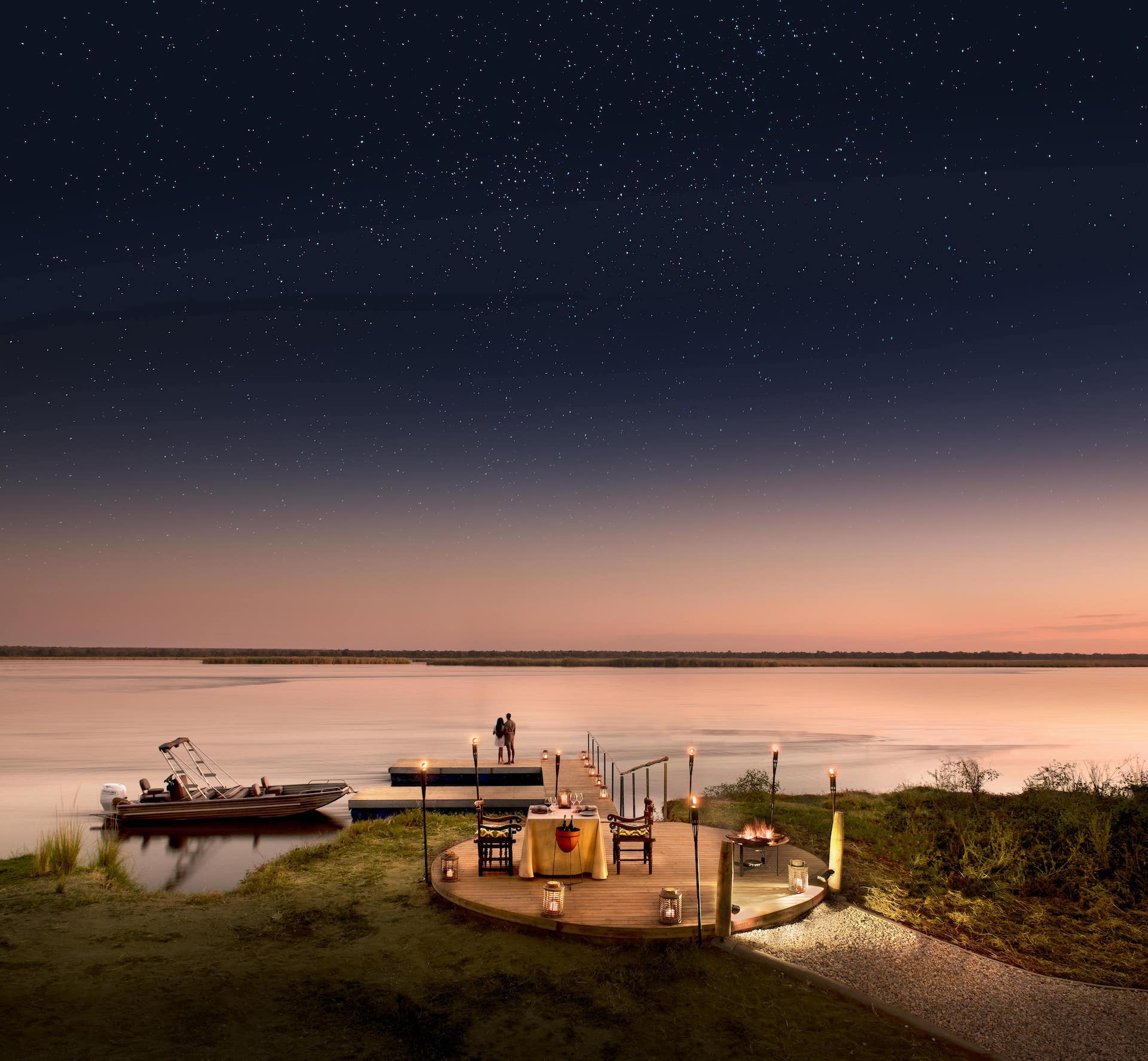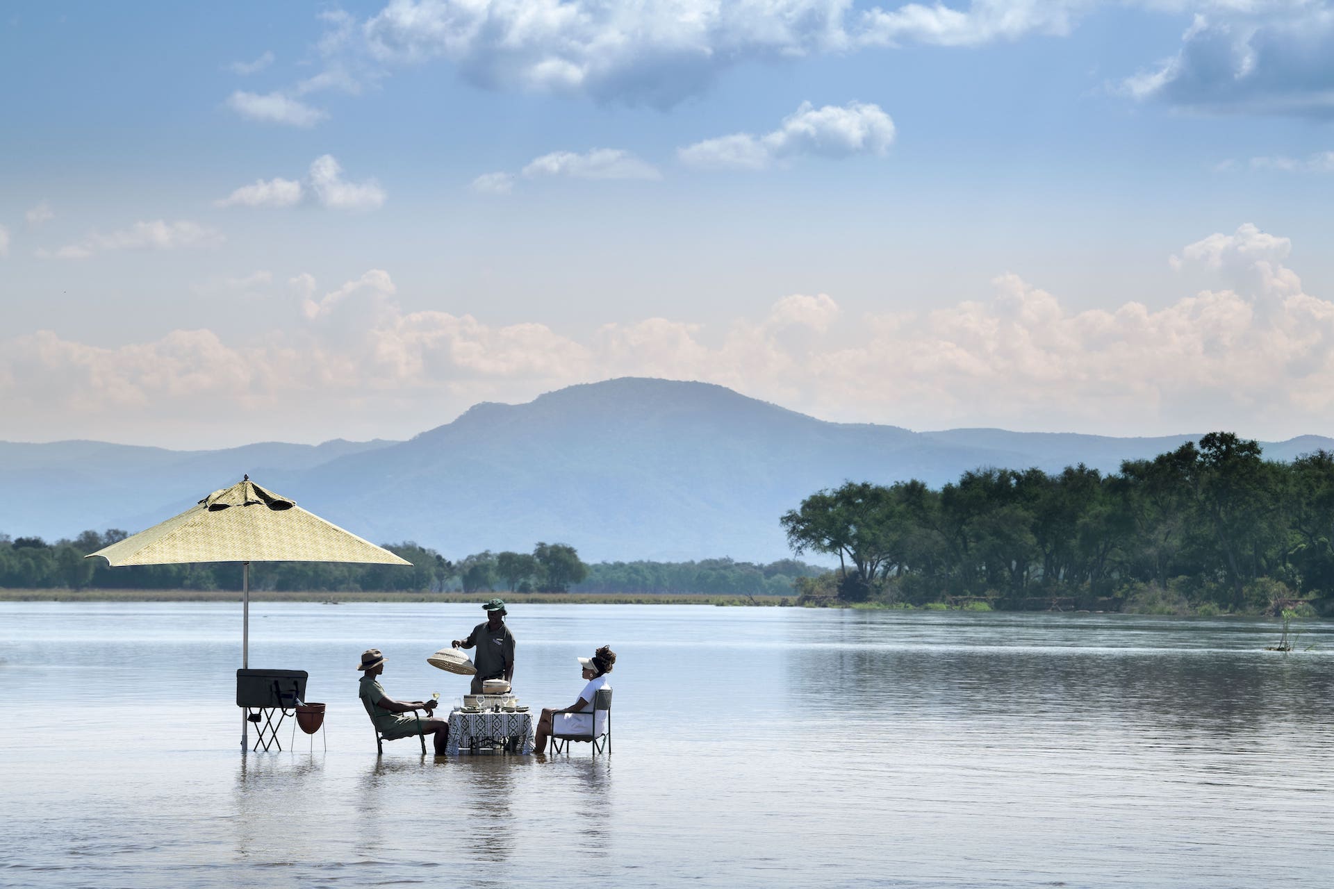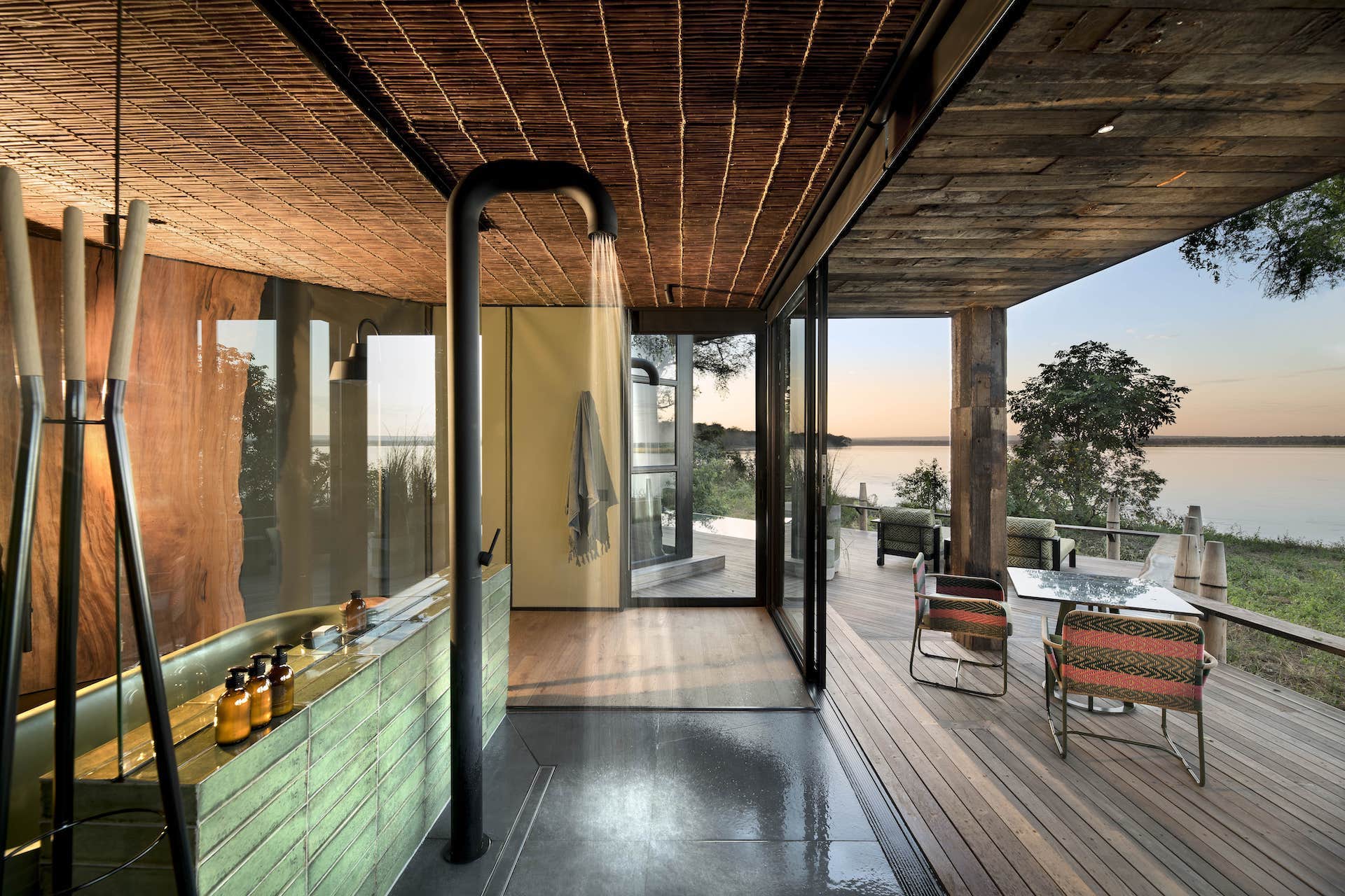 Lolebezi schwimmt praktisch auf dem Sambesi-Fluss und verfügt über einen Kilometer exklusive Flussfront. Die Hauptlodge besitzt Strohdächer, rustikale Holzeinbauten und große Glasflächen, durch die man die Aussicht genießen kann. Im Inneren gibt es ein ganztägig geöffnetes Café und eine Pizzeria, während die Bar über einer ruhigen Flussbucht schwebt. Der Infinity-Pool fügt sich nahtlos in den Fluss ein - die Liegestühle auf dem Wasser sind die besten Plätze im Haus - und das Spa bietet erstklassige Behandlungen, um die Müdigkeit des Tages zu vertreiben.