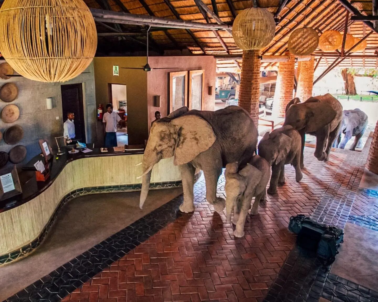 Ein spektakuläres Highlight der Mfuwe Lodge ist, dass saisonal Elefanten durch den Empfangsbereich spazieren.