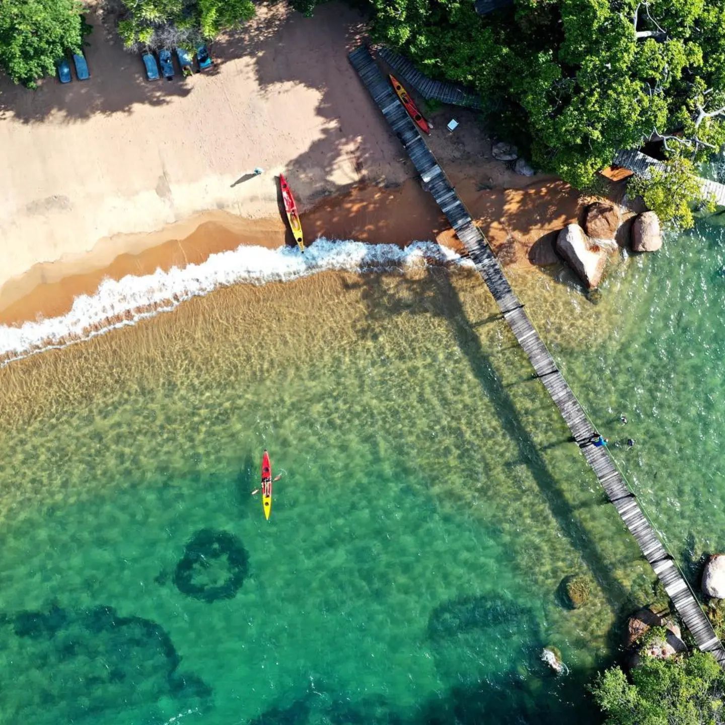 Der Hauptbereich besteht aus einem kleinen Strand mit feinem weissen Sand mit gemütlichen Sonnenliegen und einem offenen Ess-und Loungebereich mit traumhaften Blick über den See in mitten uralter Affenbrotbäume. Wer einfach nur das „Süsse nichts tun“ geniessen will sucht sich mit einem guten Buch ein schattiges Plätzchen unter den Bäumen oder erlernt das malawische Brettspiel Bawo, dass bei Groß und Klein im ganzen Land beliebt ist. Wer sich gerne aktiv erholt kann direkt vom Strand aus schnorcheln oder Kajaken.