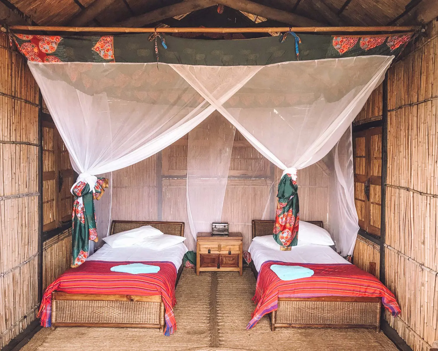 Die Unterkünfte des Mumbo Island Camps schmiegen sich in die wunderschönen Felsen auf der kleinen separaten „Jumbo“ Insel ein, die durch eine schmale Hängebrücke mit dem Hauptgebäude verbunden ist.  Die Stroh-Chalets sind einfach und rustikal mit eigenem halboffenen Badezimmern, die mit einer ökologischen Kompost-Toilette und traditionellen Kübeldusche. Jedes Chalet verfügt über einen Balkon mit Hängematt.