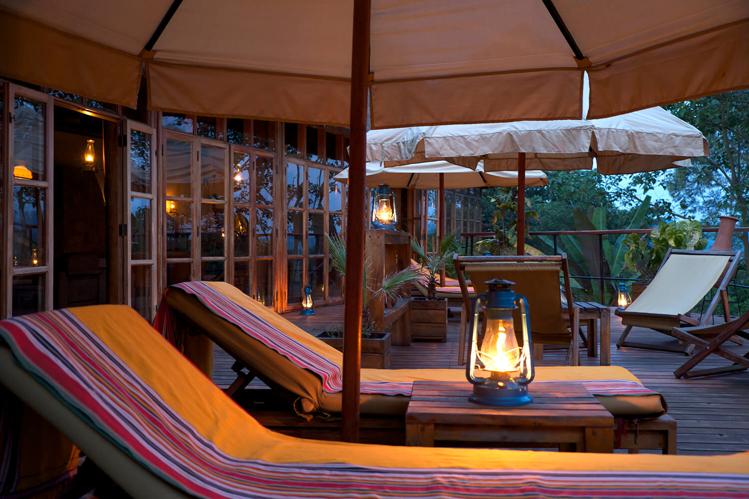 An den üppigen Hängen eines erloschenen Vulkans gelegen, bietet Papaya eine erstklassige Ausstattung, die zu seiner Lage passt. Die Lodge hat ein hervorragendes Küchenteam und serviert Gerichte aus aller Welt, die mit Zutaten aus dem hauseigenen Garten zubereitet und oft unter dem Sternenhimmel genossen werden. Den Essbereich im Innenbereich zieren Schwarz-Weiß-Fotografien aus Uganda, retro Lampen und Regiestühle. Machen Sie es sich mit einem Buch vor dem Kamin gemütlich oder trinken Sie einen Gin-Tonic auf der Terrasse mit Blick auf den See, dessen Wasser von Vögeln belebt wird.
