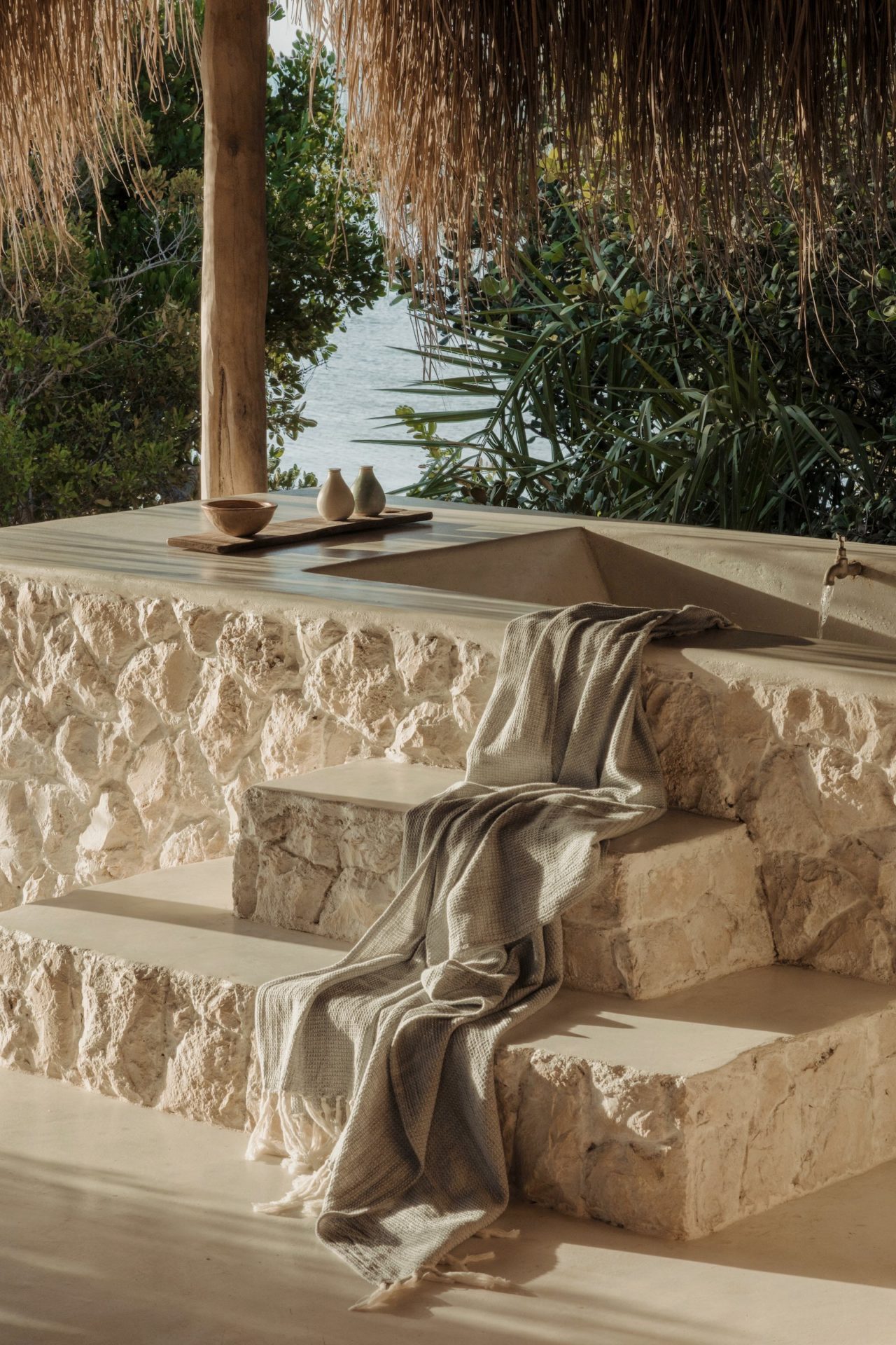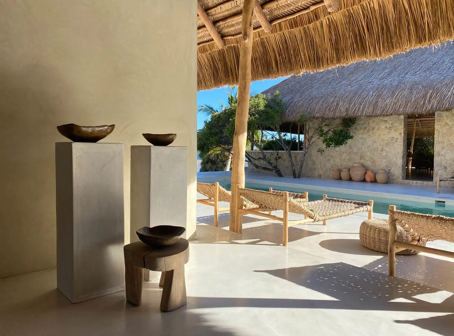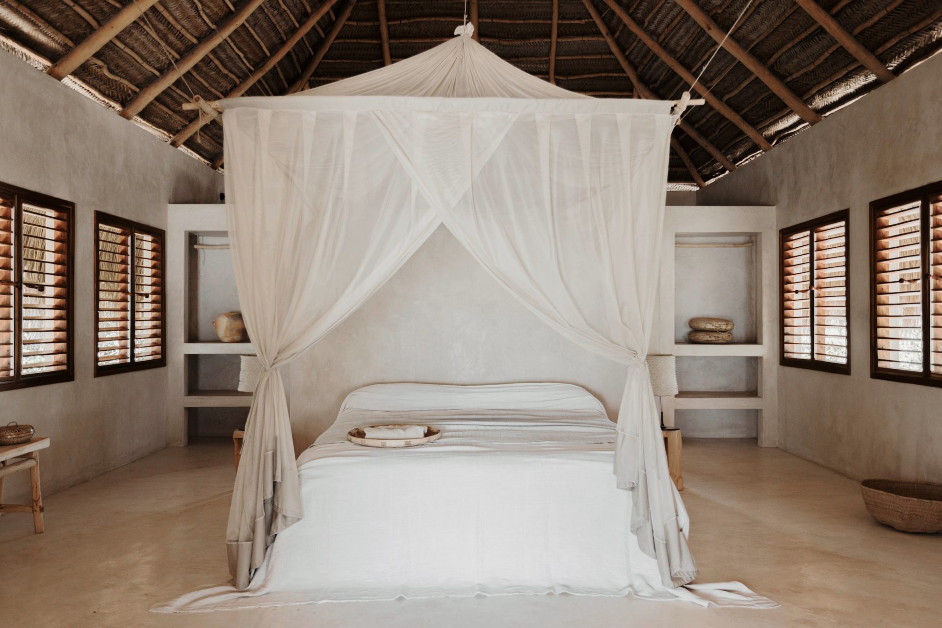 Die privaten Bungalows bieten mehr tausend Quadratmeter persönlichen Raum inmitten der Natur. Jede Suite verfügt über ein Innen- und Außenbad und eine großzügige Veranda am Wasser. Die mosambikanische Architektur webt ein natürliches Vordach über wogenden Moskitonetzen. Große Öffnungen lassen die Farben der sich ständig verändernden Landschaft in den Raum eindringen. Die Zimmer sind mit Möbeln ausgestattet, die vor Ort angefertigt und geschnitzt wurden, sowie mit sorgfältig gesammelten handwerklichen Stücken aus dem Afrika der Subsahara.